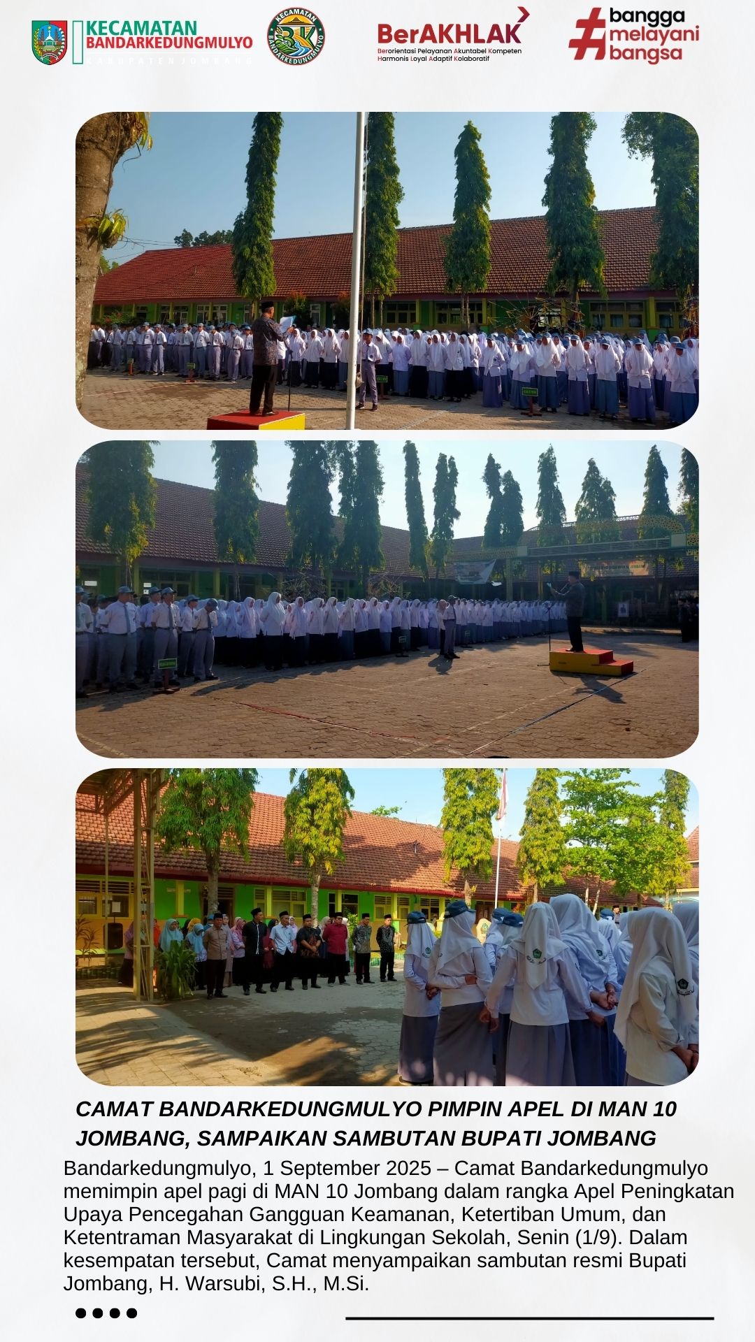 Camat Bandarkedungmulyo Pimpin Apel di MAN 10 Jombang, Sampaikan Sambutan Bupati Jombang