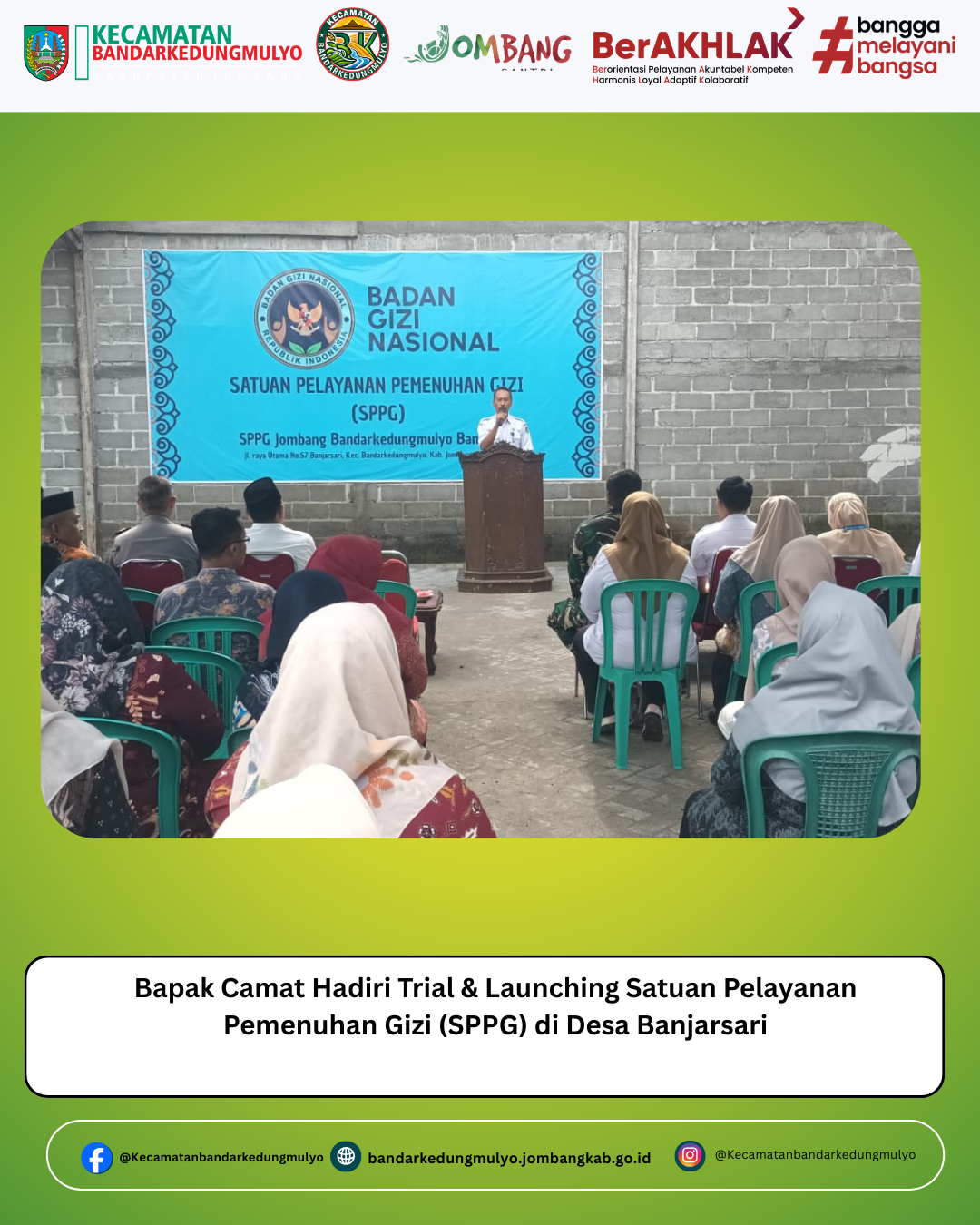 Camat Bandarkedungmulyo menghadiri kegiatan trial sekaligus launching Satuan Pelayanan Pemenuhan Gizi (SPPG) yang dilaksanakan di Desa Banjarsari. Kegiatan ini merupakan upaya pemerintah dalam mendukung peningkatan kualitas gizi masyarakat, khususnya bagi anak-anak dan kelompok rentan.