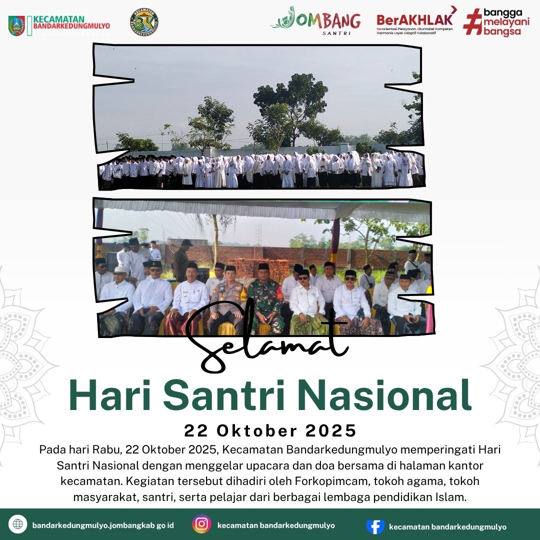 Pada hari Rabu, 22 Oktober 2025, Kecamatan Bandarkedungmulyo memperingati Hari Santri Nasional dengan menggelar upacara dan doa bersama di halaman kantor kecamatan. Kegiatan tersebut dihadiri oleh Forkopimcam, tokoh agama, tokoh masyarakat, santri, serta pelajar dari berbagai lembaga pendidikan Islam.