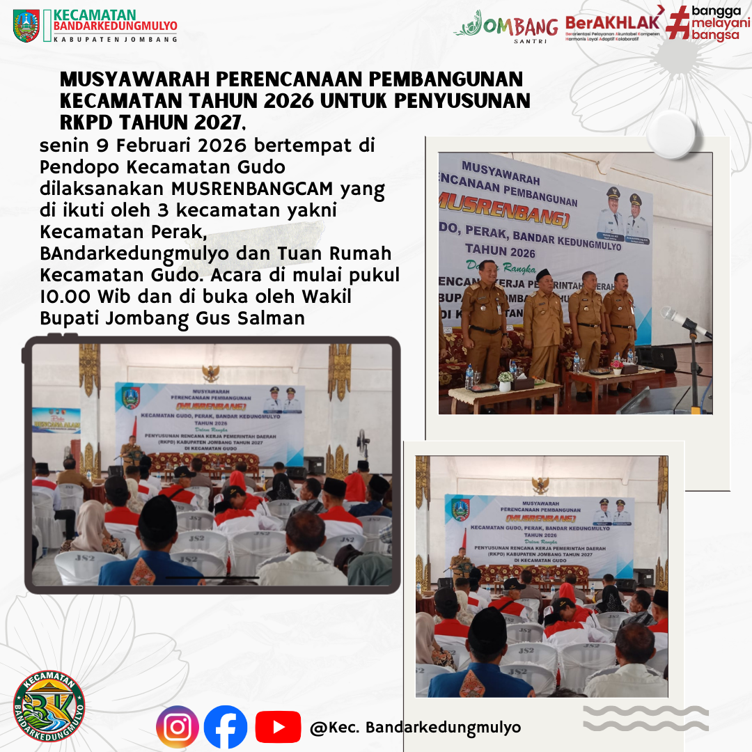 senin 9 Februari 2026 bertempat di Pendopo Kecamatan Gudo dilaksanakan MUSRENBANGCAM yang di ikuti oleh 3 kecamatan yakni Kecamatan Perak, BAndarkedungmulyo dan Tuan Rumah Kecamatan Gudo. Acara di mulai pukul 10.00 Wib dan di buka oleh Wakil Bupati Jombang Gus Salman. Acara ini untuk membahas terkait prioritas kecamatan di tahun 2026, dimana untuk kecamatan Bandarkedungmulyo kegiatan fisik prioritas kecamatan di fokuskan pada kegiatan Pelebaran Ruas Jalan Kabupaten di Ruas jalan Tinggar - Banjarsari dan Pembangunan PJU untuk ruas Jalan kabupaten desa Brangkal - Pucangsimo. Acara Musrenbangcam ini menghadirkan unsur dari Koordinator RT/RW, Kepala Desa, BPD dan unsur lembaga kemasyarakatan lainnya