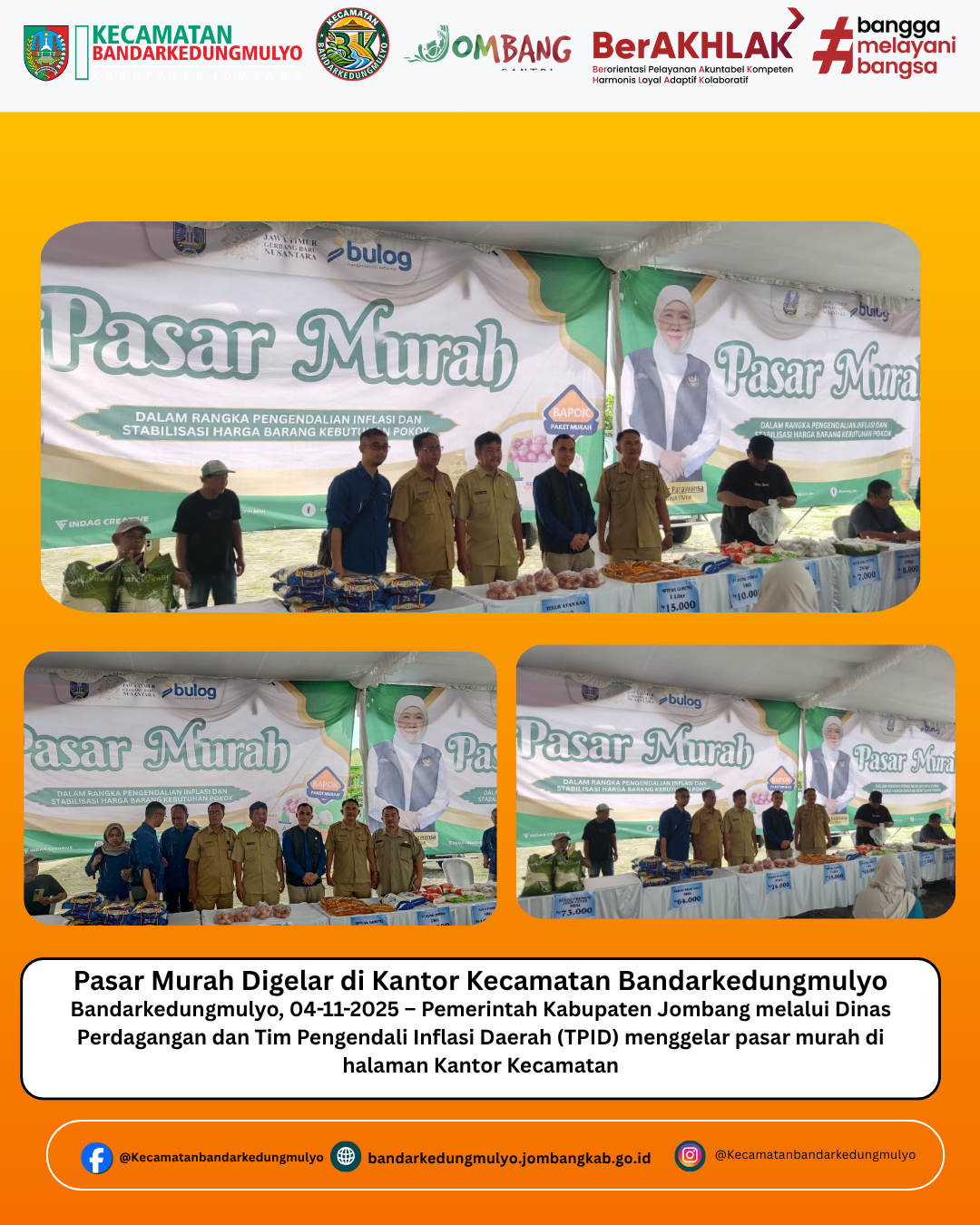 Bandarkedungmulyo, 04-11-2025 – Pemerintah Kabupaten Jombang melalui Dinas Perdagangan dan Tim Pengendali Inflasi Daerah (TPID) menggelar pasar murah di halaman Kantor Kecamatan, Berbagai komoditas seperti beras, minyak goreng, bawang merah, putih, telur ayam, dan trigu, gula pasir, dijual dengan harga di bawah pasaran. Warga sekitar tampak antusias memanfaatkan kesempatan tersebut untuk berbelanja kebutuhan rumah tangga