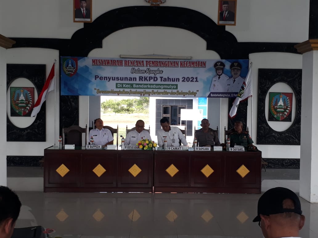 Rabu tanggal 12 Februari 2020 telah dilaksanakan musrenbang kecamatan dalam rangka penyusunan RKPD tahun 2021 yang dihadiri oleh Tim II kabupaten Jombang terdiri dari Bp. Sekda Jombang yang diwakili oleh Bapak Inpektur Kabupaten Jombang Bapak Kepala BKDPP bapak Kepala BPMPD Kepala Bappeda yang diwakili oleh Bapak sekretaris Bappeda Kepala Dinas Perhubungan Kepala Dinas Kearsipan Kepala Dinas Satuan Polisi Pamong praja Kepala Dinas Pekerjaan Umum dan Penataan Ruang UPT dan UPTD Kecamatan Bandarkedungmulyo 5 orang delegasi Desa Kepala Desa Dan Ramil, Kaplosek Kec. Bandarkedungmulyo sambutan camat bandarkedungmulyo adalah musrenbang Kecamatan merupakan forum musyawarah antar pemangku jabatan untuk membahas dan menyepakati langkah langkah penanganan program kegiatan prioritas yang tercantum dalam daftar usulan rencana kegiatan PembangunanDesa yang diintegrasikan dengan prioritas pembangunan daerah Kabupaten Wilayah Kecamatan.