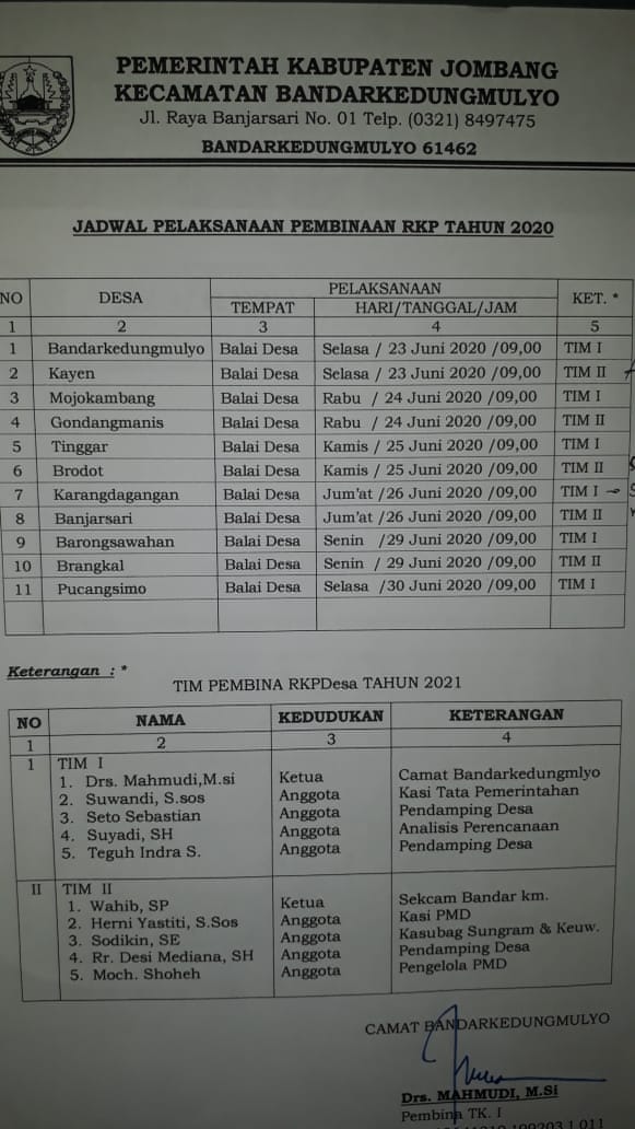 Tim Penyusun RKPDesa Kayen sebanyak 11 orang dan Tim Penyusun RKPDesa Bandarkedungmulyo sebanyak 11 orang yang dihadiri oleh Tim dari Kecamatan dan 3 pilar, kecamatan dibentuk 2 Tim