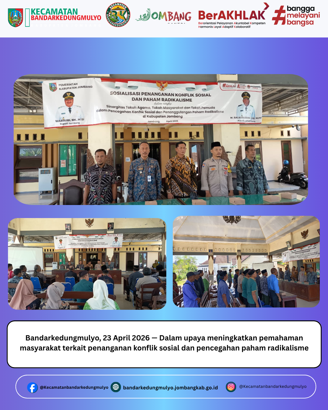 Bandarkedungmulyo, 23 April 2026 — Dalam upaya meningkatkan pemahaman masyarakat terkait penanganan konflik sosial dan pencegahan paham radikalisme, Badan Kesatuan Bangsa dan Politik (Bakesbangpol) Kabupaten Jombang bersama Camat Bandarkedungmulyo menyelenggarakan kegiatan sosialisasi yang bertempat di Pendopo Desa Banjarsari.